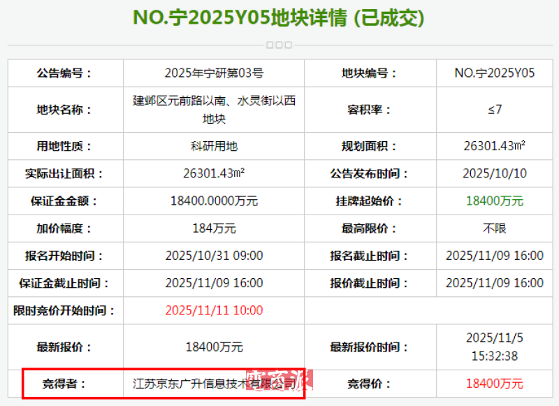 2025年,京东以1.84亿底价拿下南京河西南2025Y05地块,建设“京东集团南京研发中心”。