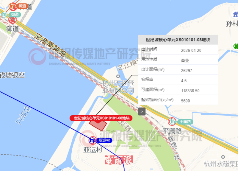 这块地西边离钱塘江只有一百多米,南边挨着地铁亚运村站和亚奥万象天地,区位优势一目了然。