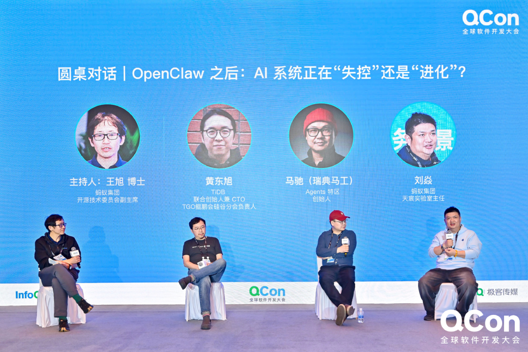 大会首日,在主论坛的压轴圆桌环节中,围绕“OpenClaw 之后:AI 系统正在“失控”还是“进化”?”主题,TiDB 联合创始人兼 CTO 黄东旭、蚂蚁集团开源技术委员会副主席王旭博士、 Agents 特区创始人马驰(瑞典马工)、蚂蚁集团天宸实验室主任刘焱四位嘉宾围绕 AI 发展、应用、安全与责任等议题展开深入交流。