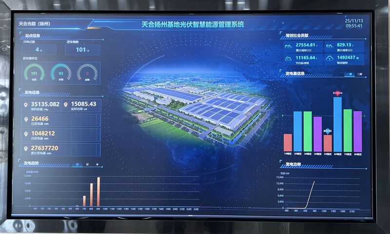 “现在我们在大屏上看到的是光伏电站并网发电后的后台实时监控,今天的阳光还是不错的,单日目前我们已经发电超27000度。”近日,记者来到位于经开区朴席镇的 天合光能 扬州基地,设施部负责人葛小刚指着行政楼大厅屏幕上的实时数据介绍道,基地光伏智慧能源系统不仅能实时显示当日发电量和发电功率,同时还能准确呈现月发电量和累计发电量,并将等效的社会价值进行转化体现。