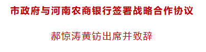 12月29日,漯河市人民政府与河南农商银行战略合作协议签约仪式举行。河南农商银行党委书记、董事长郝惊涛,市长黄钫分别致辞。河南农商银行行长王炯,副行长张涛、韩俊岭,市领导乔彦强,史耀星等出席。