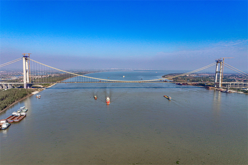 超级工程建设现场,科技硬实力不断刷新行业纪录。在建的双柳长江大桥,作为长江上最宽的悬索桥,其主缆索股的防腐与监测曾是世界性难题。湖北交投依托院士工作站,联合武汉理工大学院士团队开展专项攻关,在每根索股中植入光纤光栅传感器,如同为大桥装上“神经单元”,哪怕是0.1毫米的形变也能精准捕捉,彻底破解了大跨径悬索桥主缆长期监测的技术瓶颈。而燕矶长江大桥的“空中造塔机”更上演“高空搭积木”奇迹,这个高达百米的一体化设备,带着操作平台沿桥塔自动爬升,每小时速度可达5—10米,工人在封闭平台内作业,既规避了高空风险,又将桥塔施工效率提升30%,让“竖向移动工厂”照进现实。