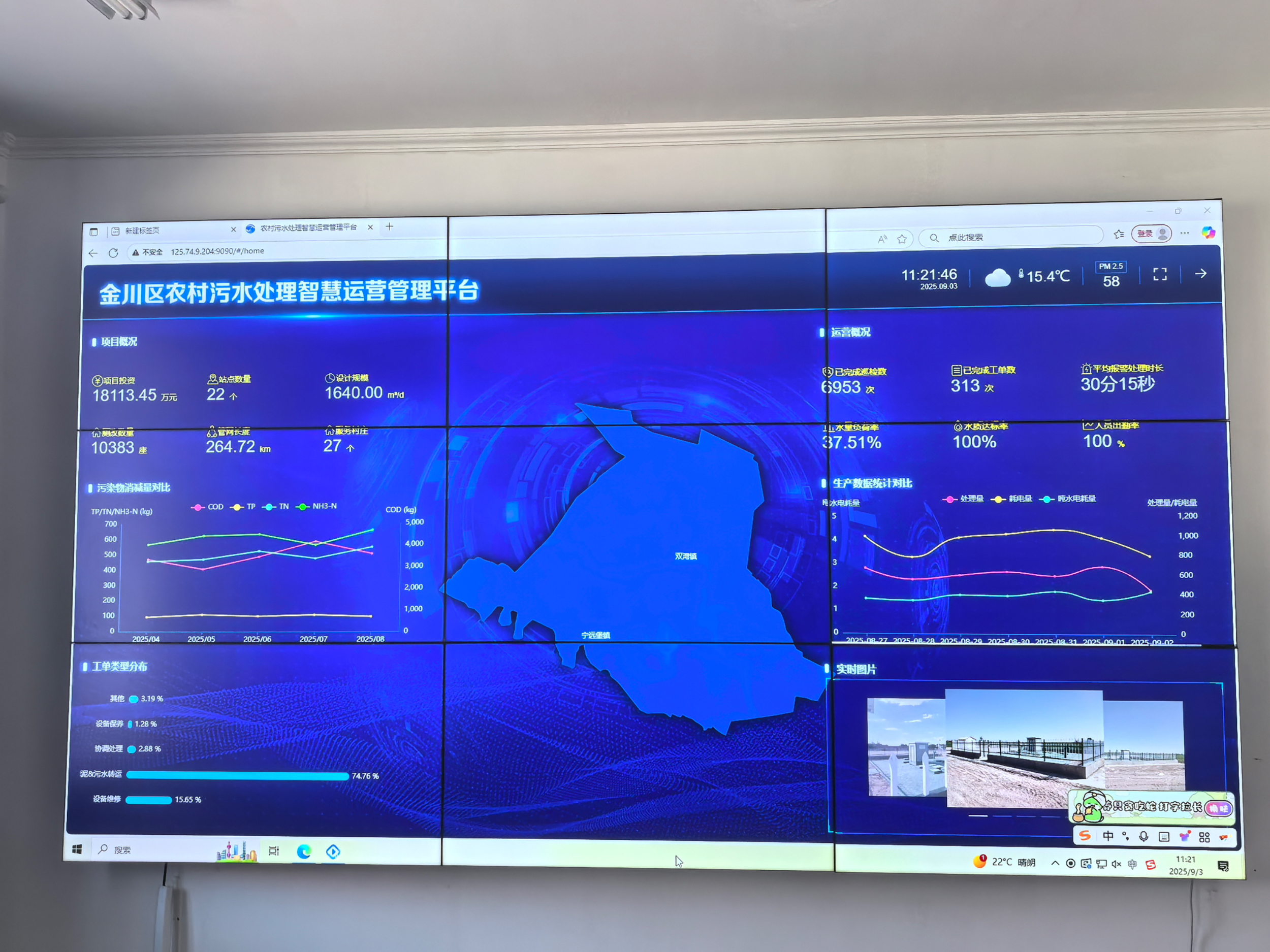 在项目调度中心,大屏实时显示着22座污水处理站的运行数据。“各个污水处理站可以实现无人值守,一旦发生故障就会自动报警,巡检人员半小时内就能到场。”盛世权还补充,“处理后的中水可用于园林绿化,缺水问题也得到很好解决。”
