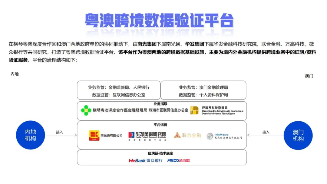 在大湾区及横琴深合区融合进程中,客户办理跨境业务面临流程繁琐、成本高、体验差等问题,机构间需平衡服务体验与隐私保护,面临数据可信等风险。为此,在深合区金融发展局、珠海市互联网信息办和澳门经济及科技发展局的协同推动下,南光通有限公司会同珠海华发金融科技研究院有限公司、万高信息科技有限公司、深圳联合金融控股有限公司和深圳前海微众银行股份有限公司等共同打造粤澳跨境数据验证平台,定位为服务粤澳机构的数字化基础设施,通过“个人数据可携带权+区块链技术”的创新模式,在金融与民生核心场景中实现了显著的降本、提效、增质突破,充分释放了数据要素在跨境服务中的赋能价值,为大湾区跨境业务高质量发展注入强劲动力。