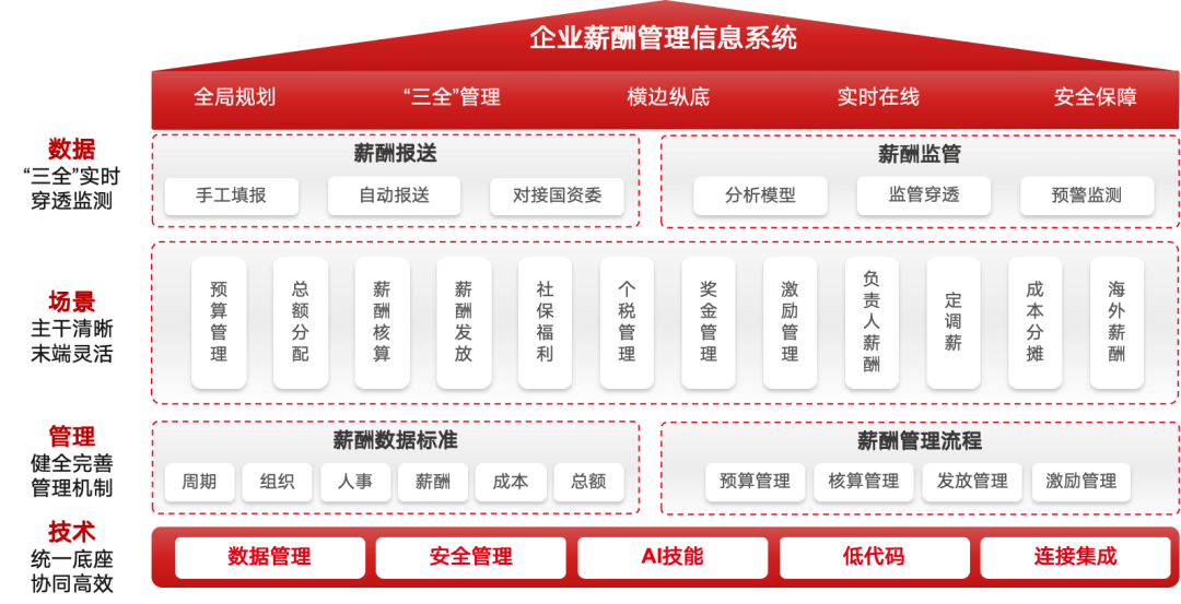 构建架岗权、人员、薪酬福利、国资薪酬报表、人工成本、报表管理的全级次功能体系,实现标准化操作、流程化驱动,实现全员、全级次、全口径”近 6000 万职工人员管理、薪资核算、国资薪酬上报等,显著降低基层工作负担,提高管理精细化水平。
