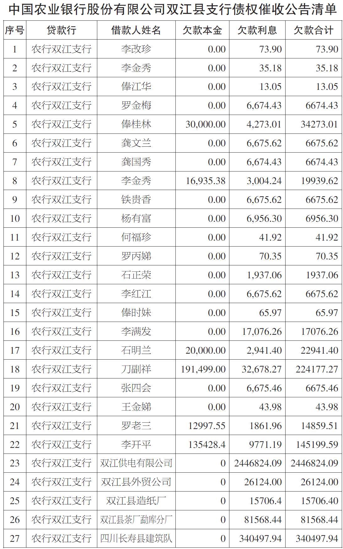 中国农业银行股份有限公司双江县支行公告下列主债权及担保债权。请下列债务人筹措资金,立即向中国农业银行股份有限公司双江县支行归还所欠债务,履行担保义务。任何单位、个人不得以任何方式逃废金融债务,否则,中国农业银行股份有限公司双江县支行将依法追偿。(地址:云南省临沧市双江县勐勐北路3号。邮政编码:677399。) 特此公告