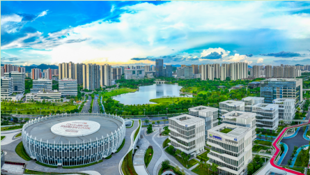 人才大厦、国际领军人才集聚区、知识大厦等地标性建筑坐落在中新广州知识城凤凰湖畔(李剑锋 摄)