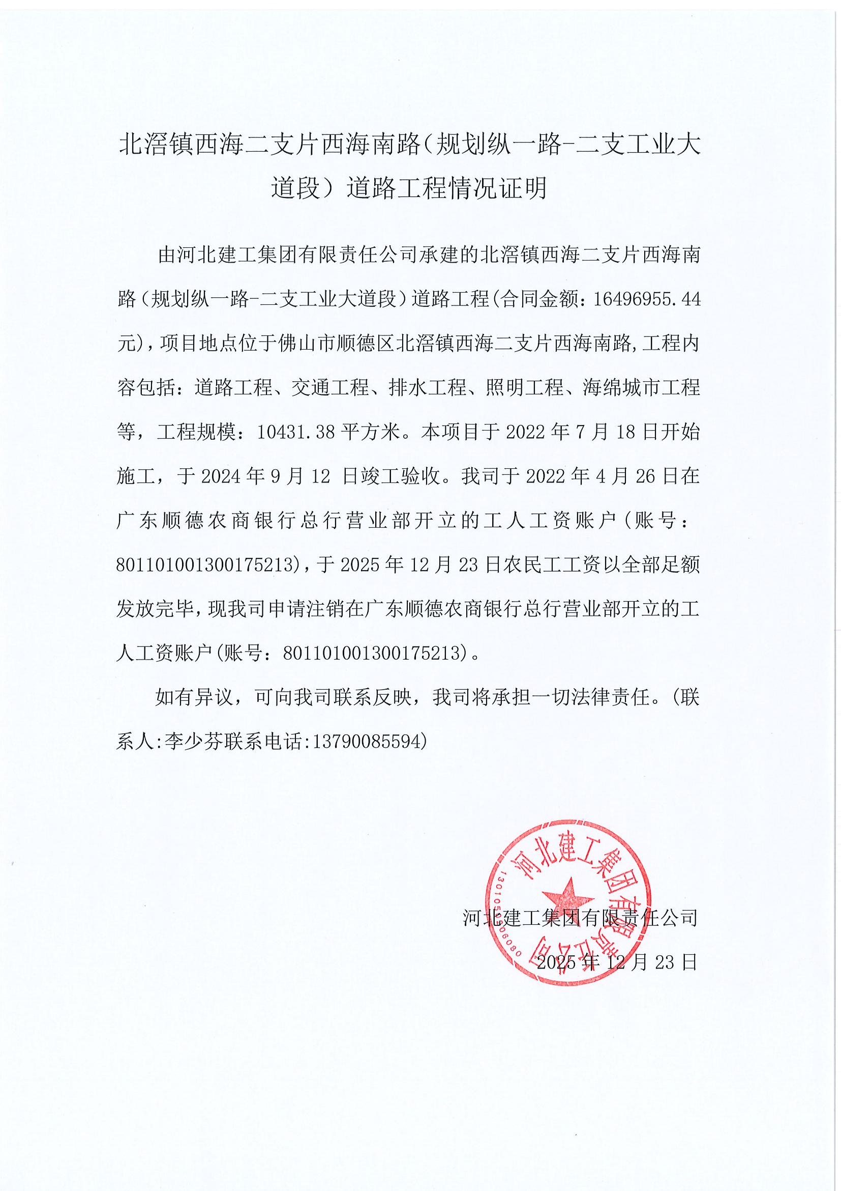 河北建工集团有限责任公司关于北滘镇西海二支片西海南路(规划纵一路-二支工业大道段)道路工程项目工人工资情况说明