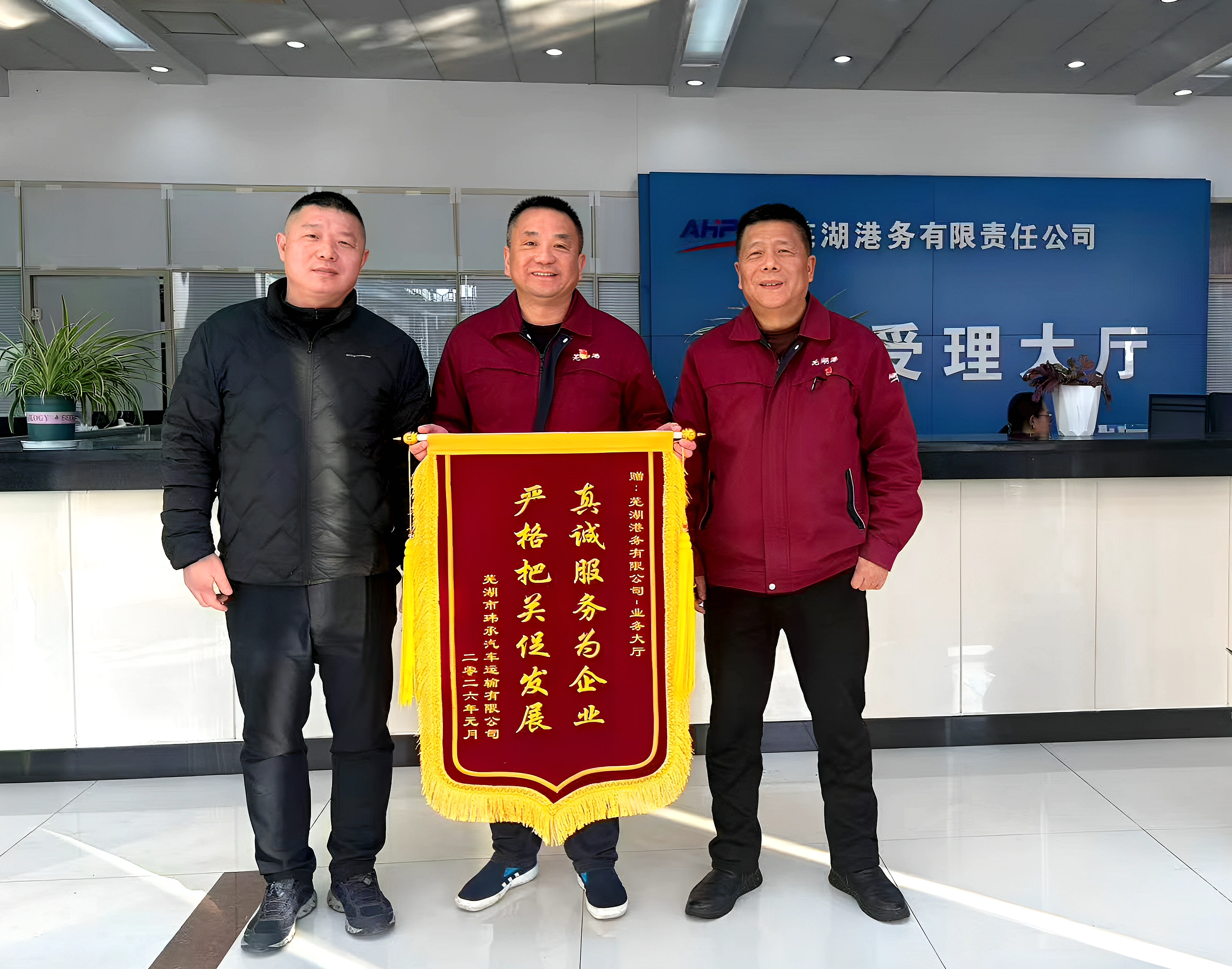 近日,芜湖市玮承汽车运输有限公司总经理带队专程到访芜湖港务公司,将两面分别镌刻“真诚服务为企业 严格把关促发展”“合作共赢 共筑辉煌”的锦旗,郑重赠予公司业务大厅与件散货操作部,以此感谢港口长期以来为其卷钢运输业务提供的全方位高效保障。此次赠旗不仅是双方深度协作、互信共赢的生动见证,更彰显了港口专业化服务在产业链中的关键支撑作用。