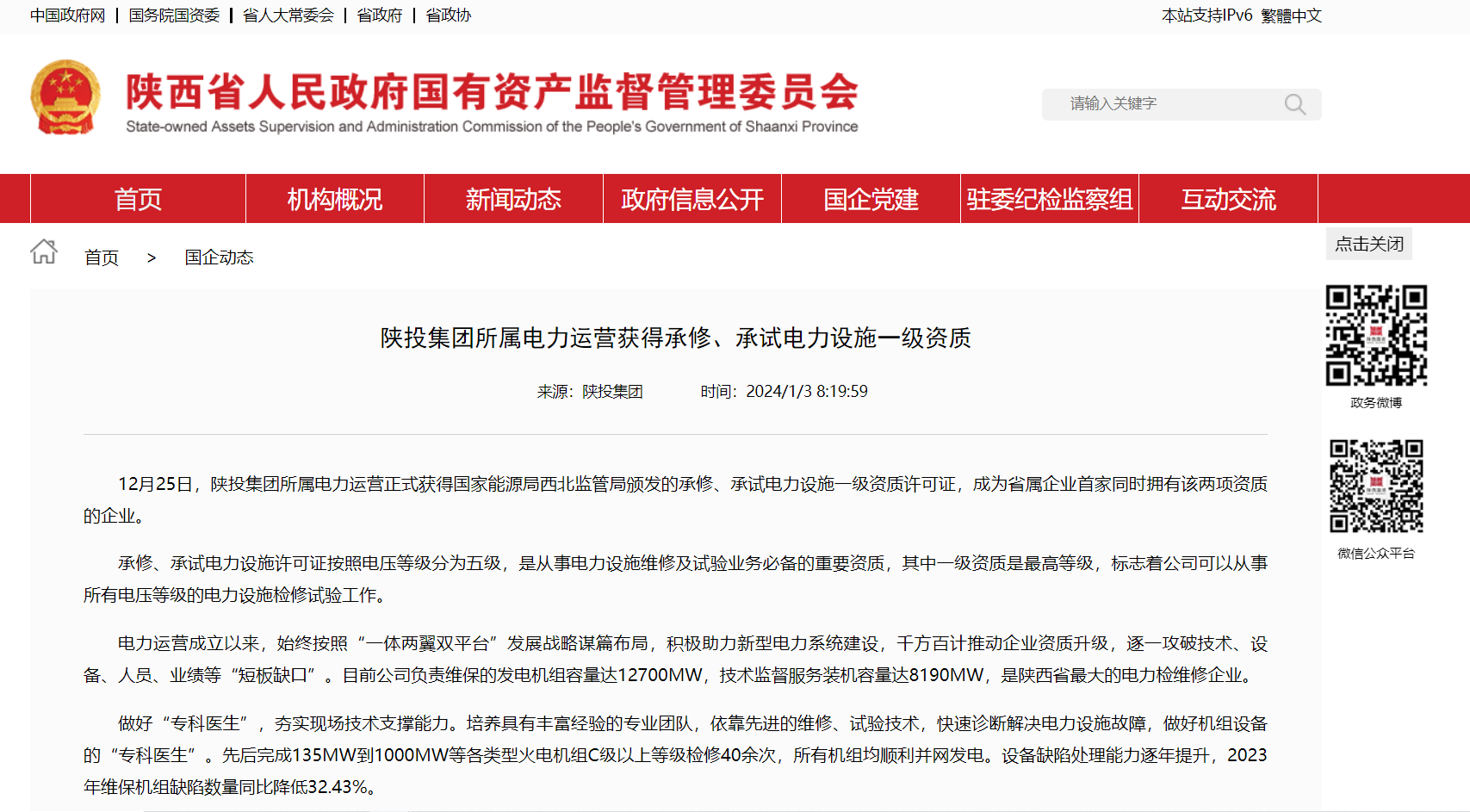 陕西省国资委:陕投集团所属电力运营获得承修、承试电力设施一级资质