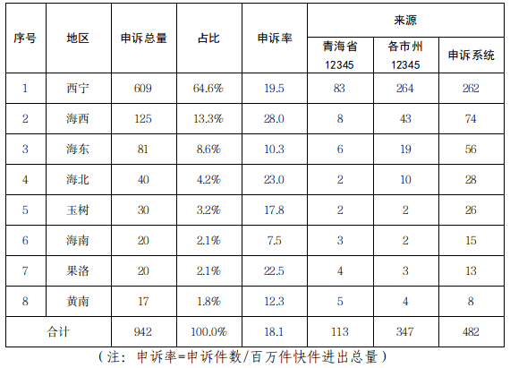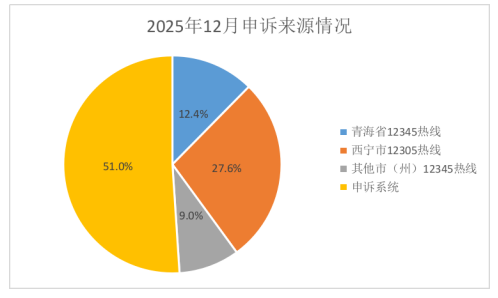 从申诉来源看: 通过省12345热线受理申诉125件、占比12.4%;通过各市州12345热线受理申诉370件、占比36.6%(其中,西宁市受理申诉279件,占总申诉量的27.6%;其他市州受理申诉91件,占总申诉量的9.0%);通过邮政业服务申诉平台受理申诉516件、占比51.0%。