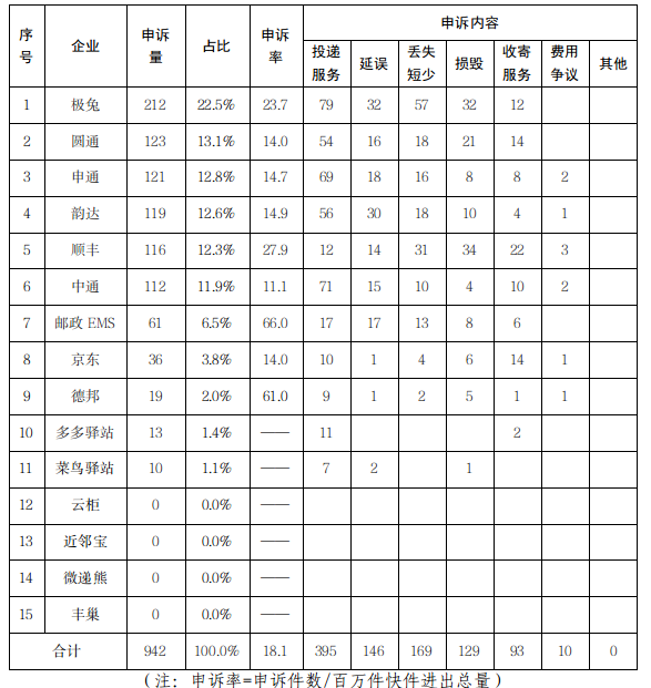 三、快递服务申诉情况