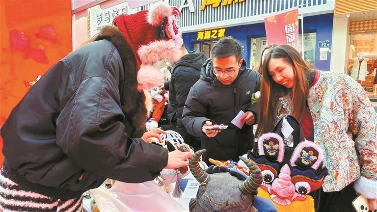 年俗文创区的红,是年味最鲜亮的底色。市级非物质文化遗产剪纸项目代表性传承人杨国权的展位前,围满了大人和小孩,剪刀翻飞间,玉兔、福字、春燕便跃然纸上。“要让老手艺活在人们的生活和记忆里。”杨国权一边递出剪好的福字,一边笑着说。红纸接过手,暖意顺着指尖蔓延,那是代代相传的年味密码。