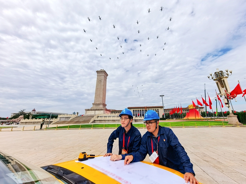 2025年8月24日,“九三”阅兵演练期间,国网北京照明中心保障人员正在天安门广场开展华灯设备巡检工作。张超 摄