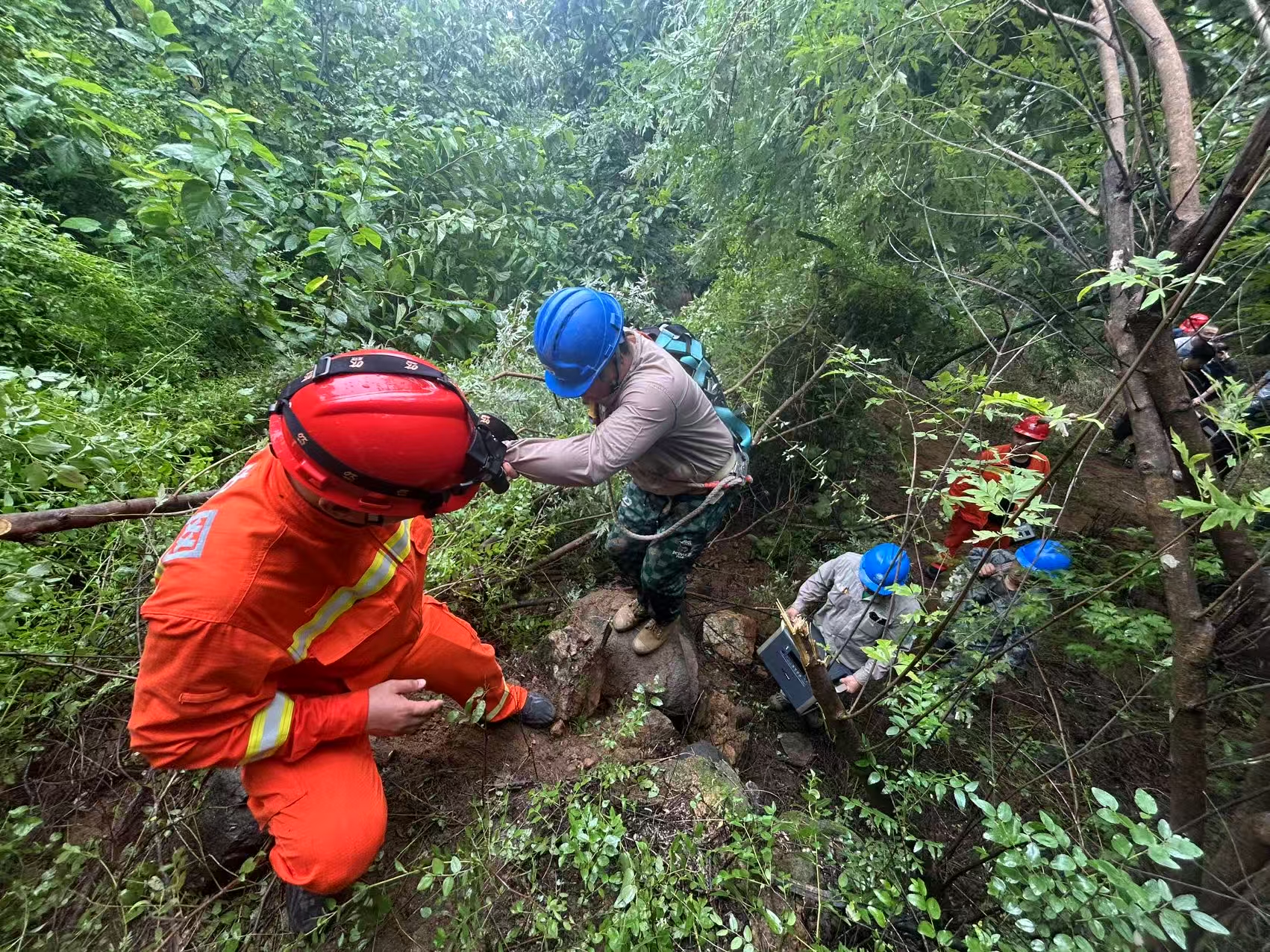 2025年7月27日,国网北京密云供电公司抢修人员携带应急发电设备,徒步进入冯家峪信号中断区域运送设备,并同步开展线路勘察工作。林一轩 摄
