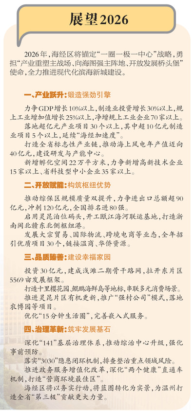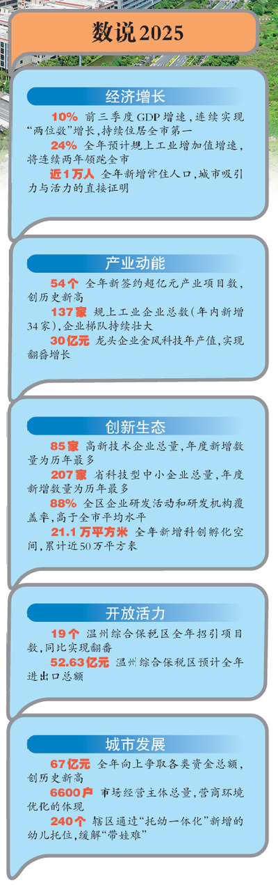 当东海潮水拍打崭新的堤岸,一个热土的故事正翻开新章。这里,塔吊与朝阳一同升起,数据随潮汐不断刷新——2025年,浙江温州海洋经济发展示范区(海经区)以一组扎实的增长曲线,刻录下新城生长的年轮。前三季度GDP增长10%,持续位居全市第一;规上工业增加值预计增长24%,将连续两年领跑全市。这既是赶超争先的速度彰显,更是一座新城从蓝图迈向现实的坚实足迹。