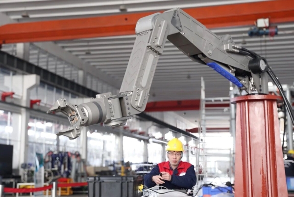 旁边的机械臂装配工位上,工程师们正在对七轴机械臂的最大旋转角度进行测试。该部件采用液压驱动,可以实现七个自由度灵活操控,将为ROV水下精准操作提供强劲支撑。