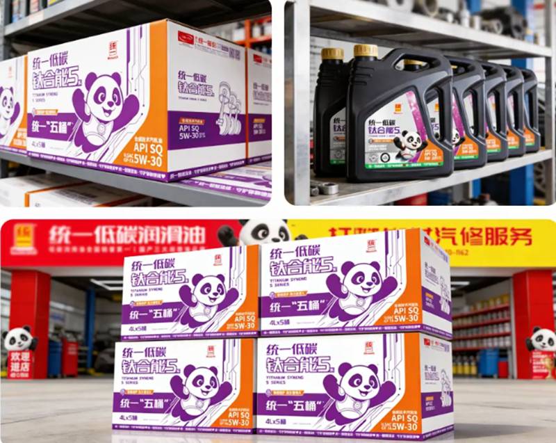 此次焕新推出的“五桶”套装,更是将技术优势与实用便捷性深度融合。5W-30、5W-40两种主流粘度可选,分别适配多数日系、美系、韩系及国产车型,以及德系车和偏好高粘度保护的车型,实现主流车型全覆盖。一次性五桶的包装设计,彻底解决了车主反复购油的烦恼,更从源头规避了真假机油的甄别风险,让保养变得简单省心。包装上的熊猫“安安”IP形象,不仅是统一智慧流体守护官的象征,更承载着对车主的安全承诺,让专业的技术保护变得更易感知。选择统一钛合能5系“五桶”,便是选择一份全周期的技术守护,让每一次出行都安心无忧。