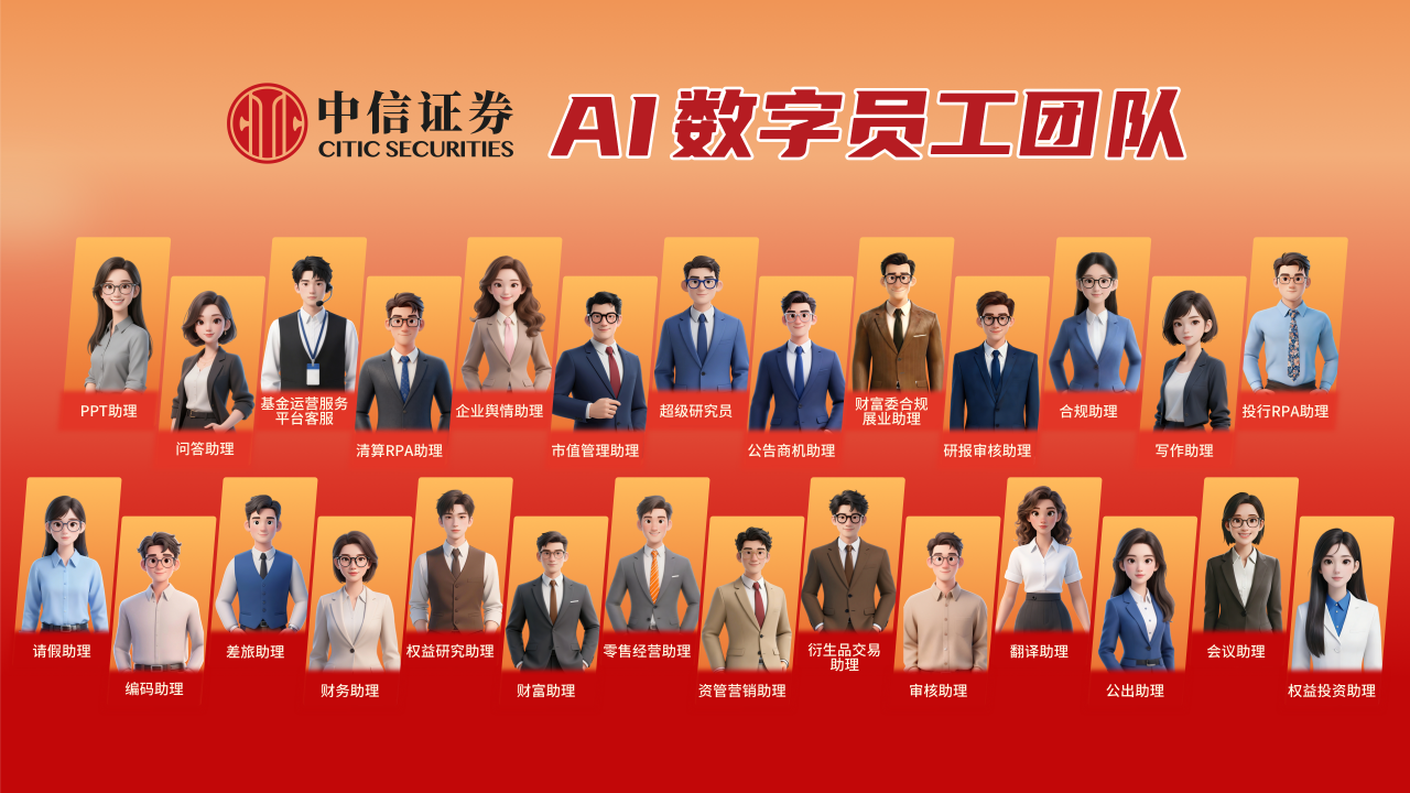 2025年,中信证券上线首批27名AI数字员工,每日调用token数突破50亿,调用token总量达5000亿,建立起行业领先的数字员工分类分级管理体系,在各业务领域创造直接经济效益,相关技术已荣获12项国家发明专利。中信集团总部聚焦员工日常办公高频需求,推出制度助手、会议助手等首批6名数字员工,赋能员工办公效能提升。