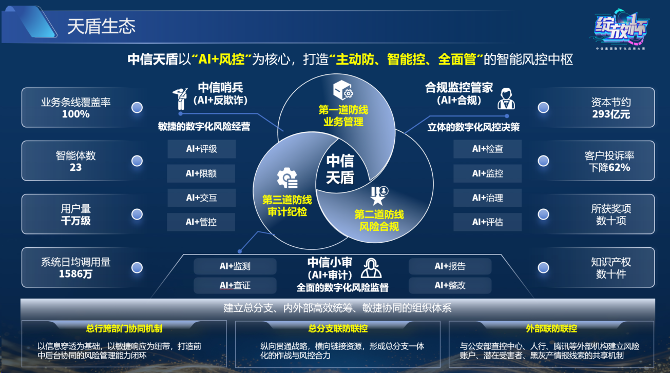 面对电信诈骗与内部操作风险交织的挑战,中信银行打造了以“AI风控”为核心的智能风控中枢“中信天盾”。项目创新采用“大小模型协同”架构,融合知识图谱等技术,构建了“感知—决策—处置—反馈”闭环,形成“主动防、智能控、全面管”完整体系,在业内首创多模态交互式反欺诈能力。该项目已累计拦截涉案资金35.3亿元,查控可疑账户49.8万户,树立了行业风控新标杆。