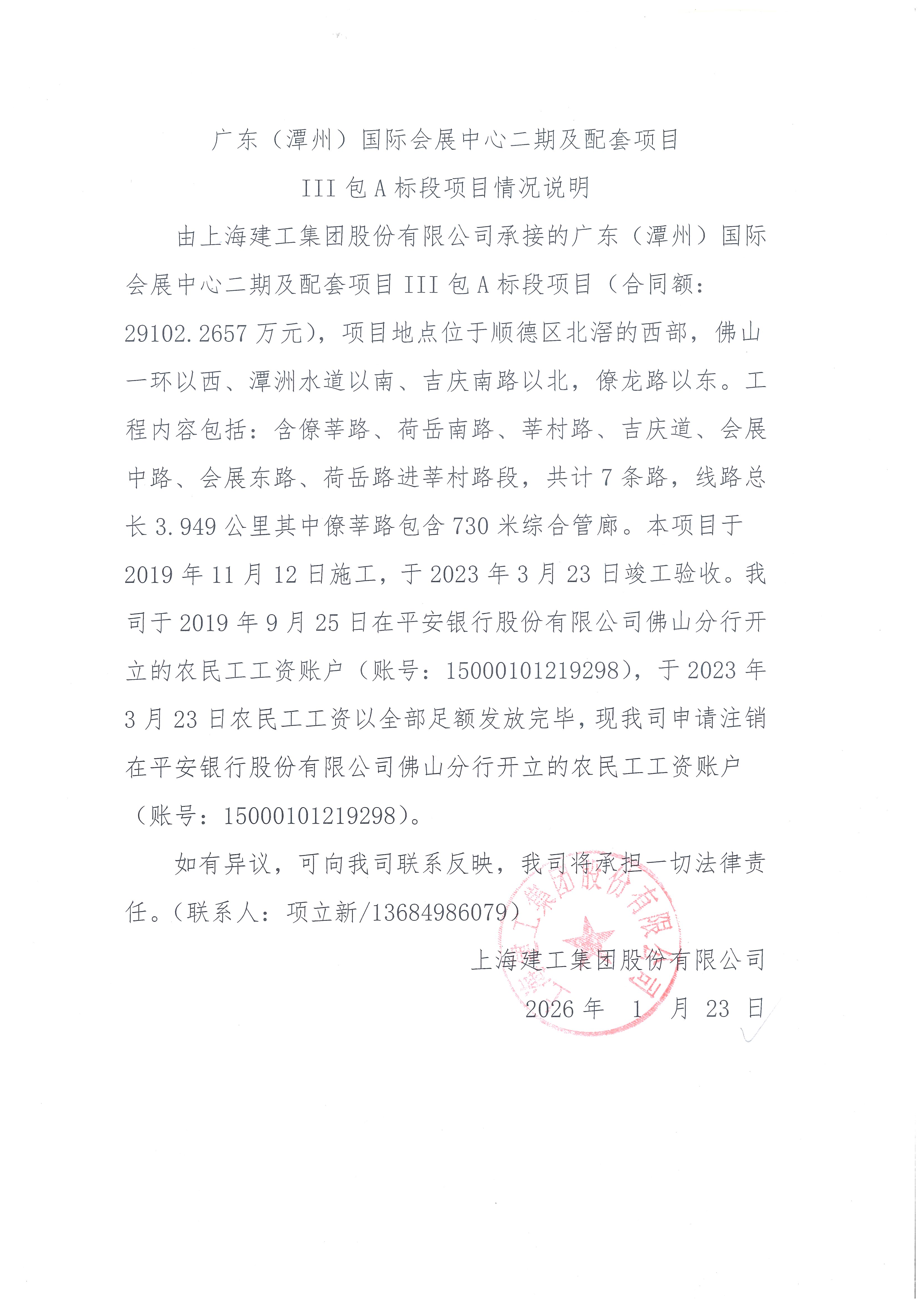 上海建工集团股份有限公司关于广东(潭州)国际会展中心二期及配套项目III包A标段项目工人工资情况说明