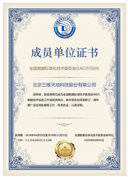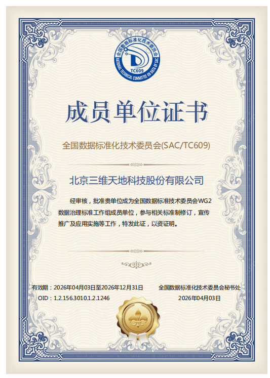 此次获得双料证书,是对三维天地在数据领域深耕多年、专业能力突出的有力佐证,标志着公司正式跻身国家数据标准体系建设核心阵营。作为数据要素领域行业标杆企业,三维天地多年来积极投身数据标准制修订工作,已发布《信息技术 大数据 数据资源规划》《信息技术 大数据 数据治理实施指南》《信息技术服务 数据资产管理要求》《大数据 主数据管理要求》,正在研制《产品主数据 模型分类》《数据产品 描述要求》,积极参与《数据管理 数据分类分级指南》《数据质量评价指标》《数据资产价值评估方法》等多项国家标准的修订与完善,将自身实践经验融入标准制定,推动行业数据管理规范化、标准化发展。此次入选两大工作组,公司将进一步发挥技术优势,深度参与数据治理、数据技术领域国家标准的制修订、宣传推广及应用实施,助力构建科学完善的国家数据标准体系。
