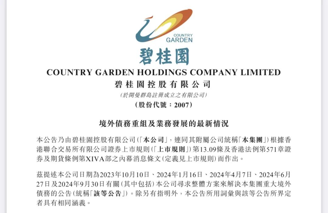 1月9日,碧桂园控股有限公司发布公告,披露了境外债务重组及业务发展的最新情况。