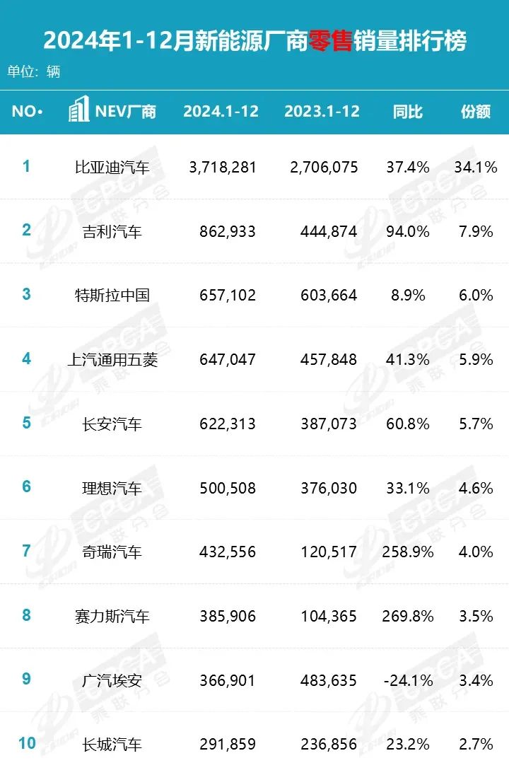 2024年中国乘用车、新能源乘用车企销量前十