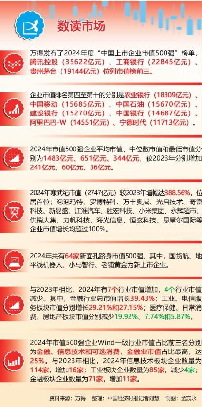 编者按最新发布的2024年度“中国上市企业市值500强”榜单显示,腾讯控股(35622亿元)、工商银行(22845亿元)、贵州茅台(19144亿元)位列市值榜前三。进入新的一年,2024年年报预告披露也陆续开启。据不完全统计,在已发布2024年度业绩预告的117家上市公司中,约60%的公司业绩预告为预喜类型。本期资本市场将分析“中国上市企业市值500强”榜单和已发布年报预告的公司特点,以及主板、创业板、科创板公司的变化。目前来看,预喜率前三的行业分别为公用事业、农林牧渔、交通运输。
