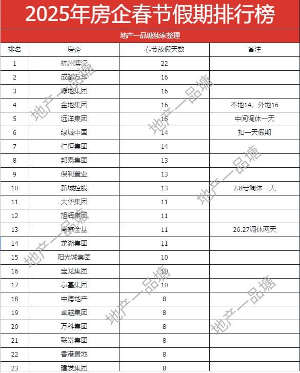 滨江22天,金地16天,远洋15天,2025年房企春节假期榜单出炉
