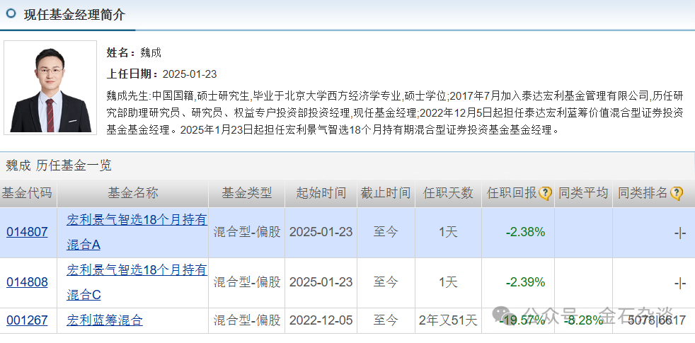 6)宏利景气智选18个月,规模只有0.93亿,该产品由魏成接手,他2017年7月加入宏利基金,从研究员到专户到基金经理,目前投资经验只有2年出头,任职亏损超20%。属于接手王鹏产品经理中水平最差的一位。