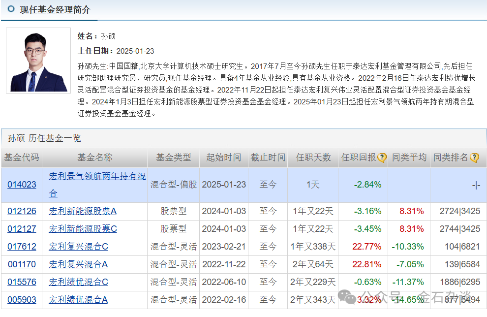 3)宏利景气领航由新人孙硕接手,他17年加入宏利,22年开始担任基金经理,属于宏利培养的新人,目前只有3年投资经历。整体业绩同样可圈可点。