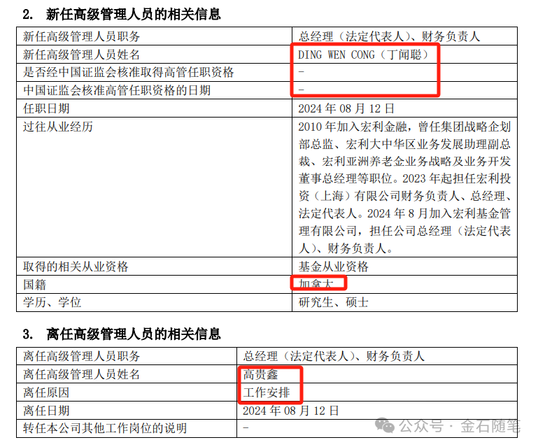 但是,刚干了一年半,高贵鑫也离职了。8月中旬,根据公告,高贵鑫因为工作安排卸任总经理和财务负责人,加拿大国籍的丁闻聪升任宏利基金总经理、法定代表人和财务负责人。(丁闻从还全程主导参与宏利基金收购项,从合资变成了外资独资)