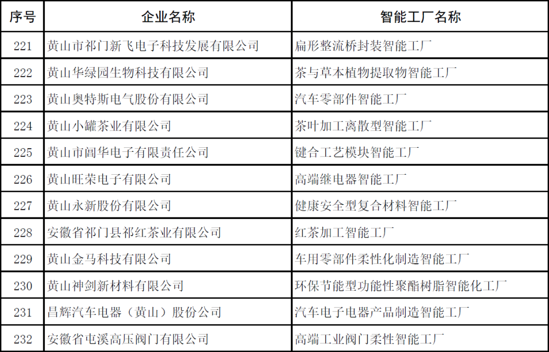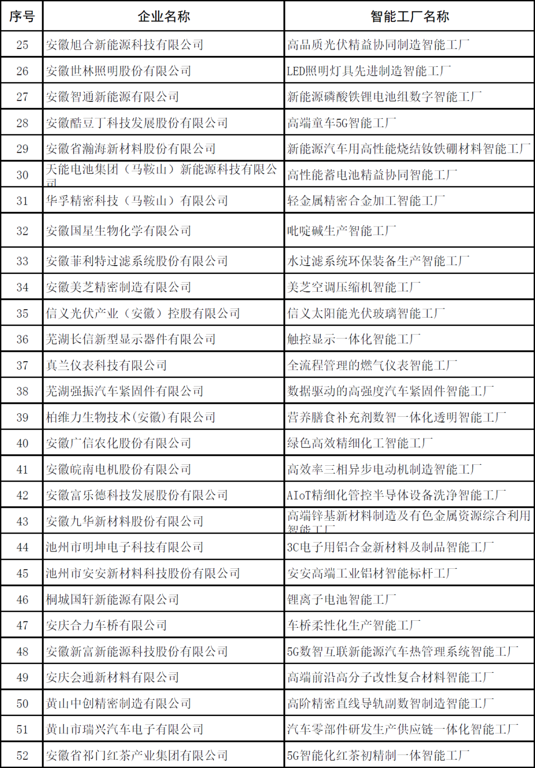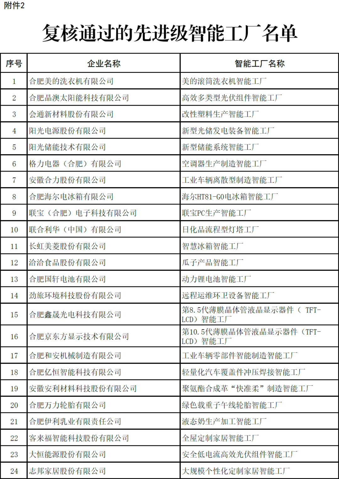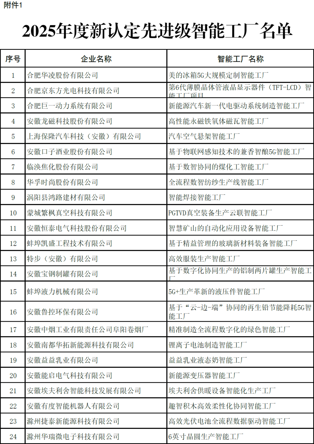 根据《安徽省智能工厂梯度培育行动实施方案》和《安徽省工业和信息化厅关于开展2025年度智能工厂梯度培育工作的通知》,按照相关程序,现对2025年度新认定的52个先进级智能工厂和复核通过的232个先进级智能工厂进行公示,公示期为2025年7月3日-7月9日,如有异议,请在上述期限内实名向省工业和信息化厅装备工业处反映。