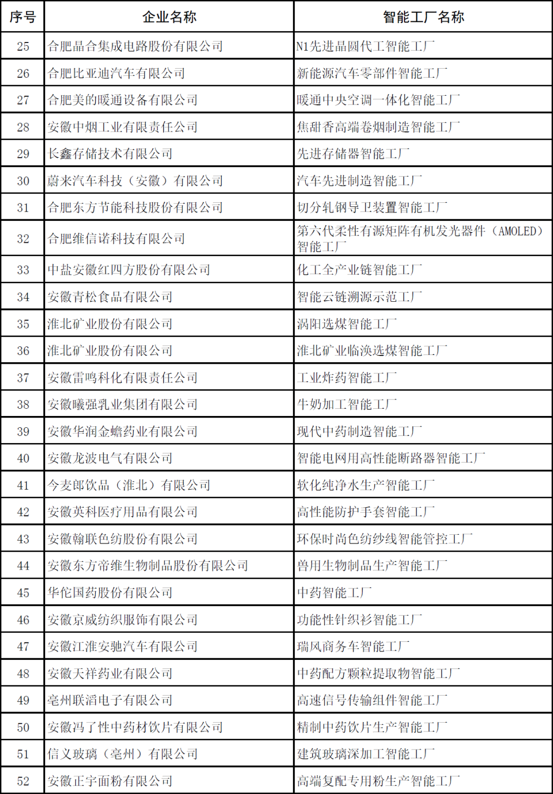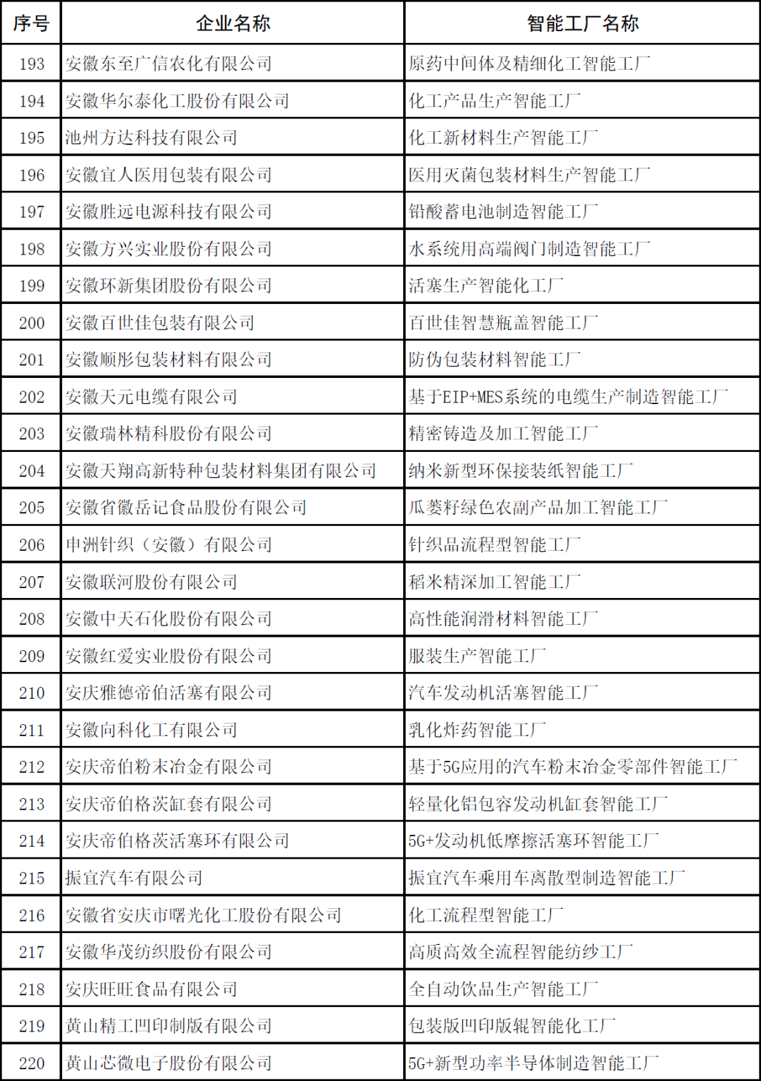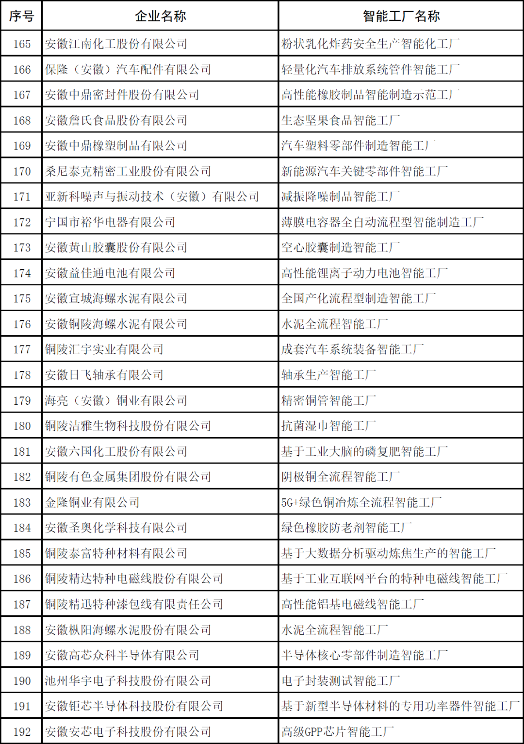 根据《安徽省智能工厂梯度培育行动实施方案》和《安徽省工业和信息化厅关于开展2025年度智能工厂梯度培育工作的通知》,按照相关程序,现对2025年度新认定的52个先进级智能工厂和复核通过的232个先进级智能工厂进行公示,公示期为2025年7月3日-7月9日,如有异议,请在上述期限内实名向省工业和信息化厅装备工业处反映。