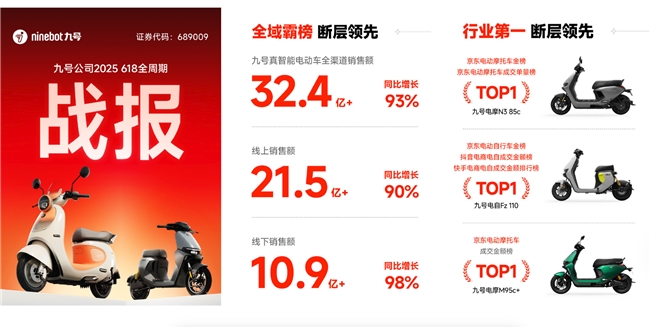 而在刚刚过去的618活动中,九号公司也传来捷报:数据显示,今年“618”九号公司再创新高,“618”全周期内,九号公司全渠道销售额达33.5亿元,其中九号真智能电动车全渠道销售额就占了32.4亿元,同比增长93%,延续领跑行业的高增长态势,彰显了九号公司在智能短交通领军者实力!
