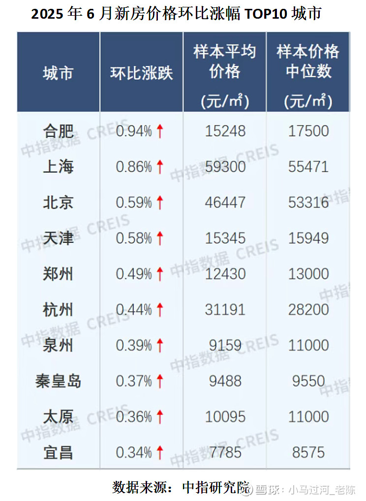 其中,上海和合肥新建住宅价格分别以0.94%和0.86%的涨幅居前两位,紧随其后的北京环比涨幅为0.59%,成都、杭州的环比涨幅均超过0.1%。
