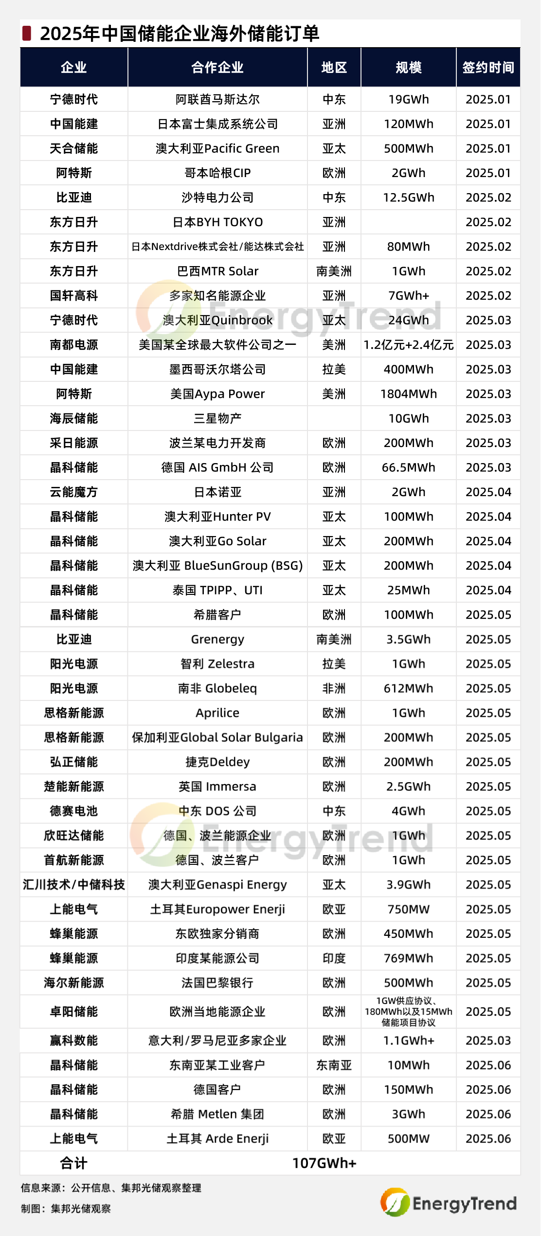 这一系列订单的落定,彰显了我国储能在全球储能系统领域的迅猛发展态势。今年以来,众多中国储能企业在海外市场持续发力,“承包”全球储能大单。据集邦光储观察不完全统计,2025年上半年,中国储能企业海外订单签约已超107GWh。