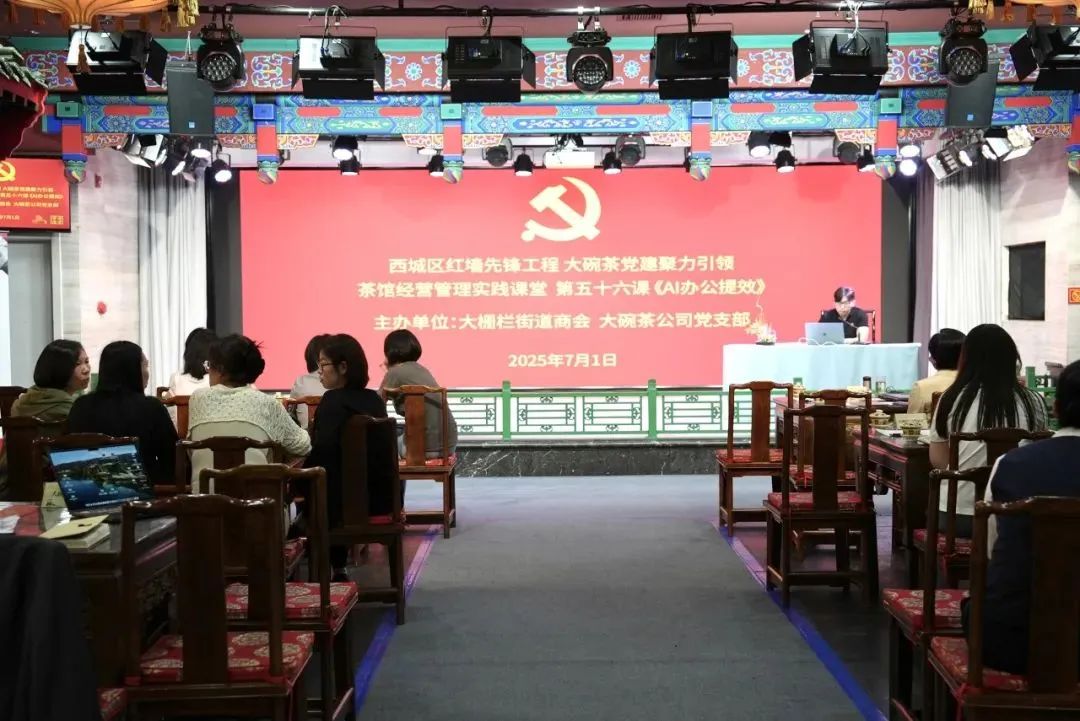 值此中国共产党成立104周年之际,7月1日上午,由大栅栏街道商会与北京市大碗茶文化发展有限公司党支部联合主办的“西城区红墙先锋工程大碗茶党建聚力引领茶馆经营管理实践课堂”第五十六课《AI办公提效》在西城区党员教育基地——大碗茶党支部党建教研基地老舍茶馆举办。