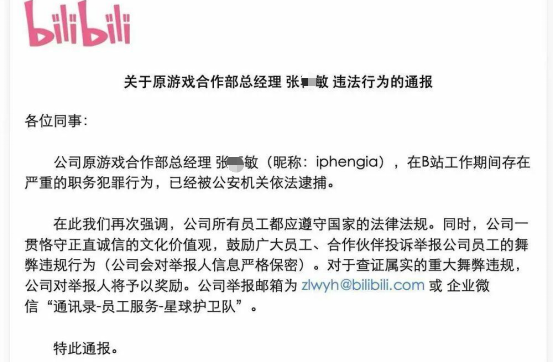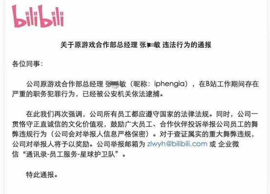 近日,B站向全体员工发送了一封邮件,通报原游戏合作部总经理张某敏在工作期间存在严重的职务犯罪行为,已经被公安机关依法逮捕。