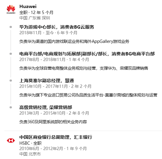 这起事件的其中一大看点是张某敏本人的工作履历。据公开资料显示,张某敏曾先后在汇丰银行以及华为等知名企业工作,在汇丰银行担任过中国区商业银行总裁助理,在华为还曾担任过高级营销经理、电商平台部和电商规划与拓展部的副部长、部长,甚至是华为游戏中心部长。