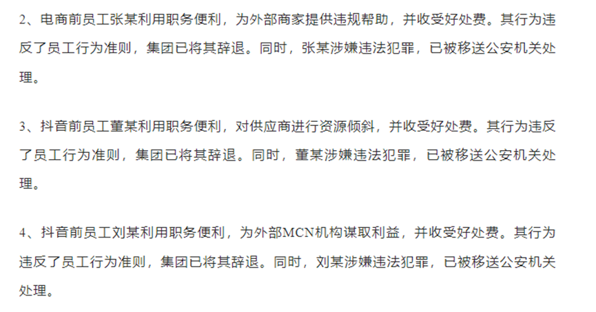 抖音在今年3月底发布的2024年下半年反舞弊通报中,提到了各类腐败行为,包括利用职务便利为外部商家提供违规帮助,收受好处费、对供应商进行资源倾斜、为服务商谋取利益、协助商家和服务商侵占公司补贴等等。这些腐败案件涉及到的业务范围广,包括电商、直播、本地生活等。