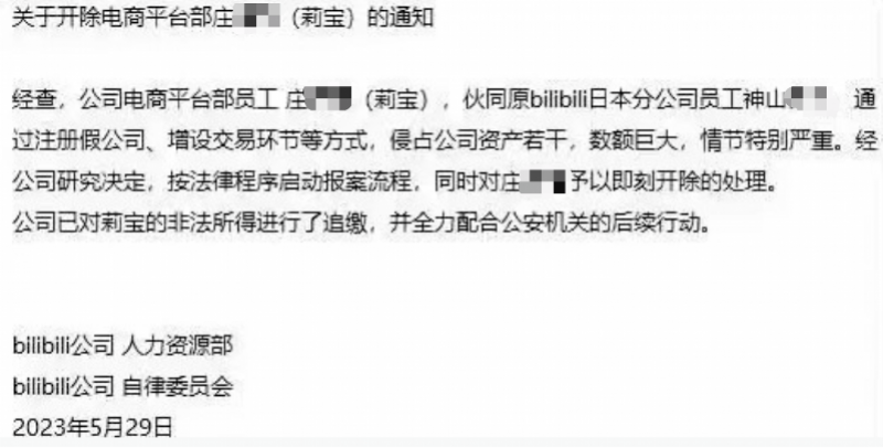 紧接着2023年,B站再次在内部通报员工舞弊违规案例,这次是电商部门的员工。根据当年5月份的通报,公司电商平台部员工庄某琴伙同原bilibili日本分公司员工神山宙树,通过注册假公司、增设交易环节等方式,侵占公司资产若干,数额巨大,情节特别严重。