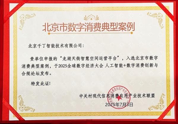 随着数字经济与实体经济融合深化,千丁数科的”AI空间智能体”为商业空间运营提供了可落地的数智化解决方案,为人工智能在消费领域的应用提供了有效参考范式。"龙湖天街智能空间运营平台"、"云境智慧空间运营平台"等先后入选北京市数字消费典型案例、北京市数字消费新技术解决方案。其技术实力与应用价值获得了行业的双重肯定。