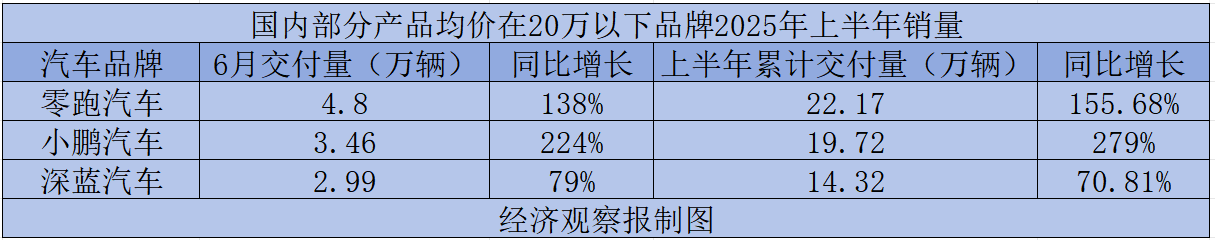 与中高端市场销量分化的趋势相比,产品均价在20万元以下的几个品牌,如零跑汽车、小鹏汽车、深蓝汽车等则实现了高速增长。