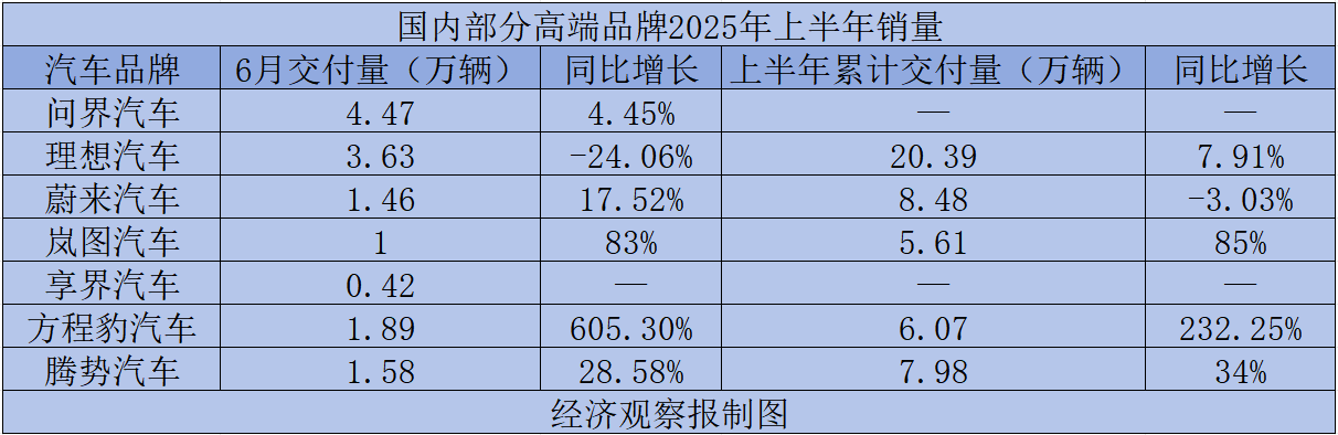 具体而言,在产品平均售价30万元以上的高端品牌中,问界汽车6月全系交付4.47万辆,同比增长4.45%。其中问界M9 2025款交付1.37万辆,问界M8 交付2.12万辆。