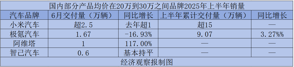在产品平均售价20万元至30万元的市场中,阿维塔品牌6月交付1万辆,同比增长117%。智己汽车6月交付6027辆,同比基本持平。