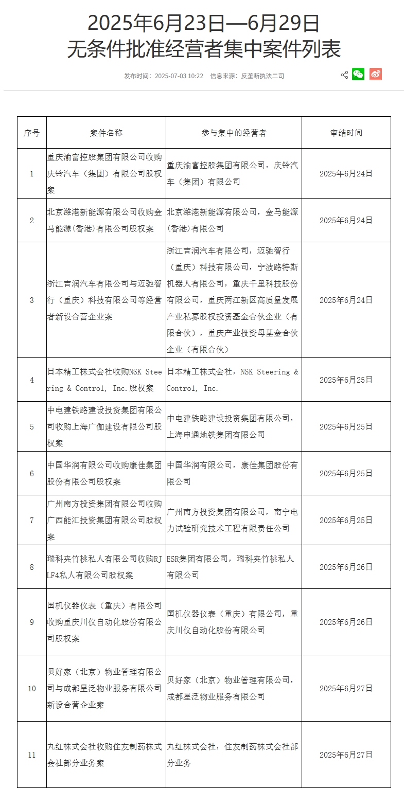 国家市场监督管理总局网站3日发布2025年6月23日—6月29日无条件批准经营者集中案件列表,其中包括中国华润有限公司收购康佳集团股份有限公司股权案等。