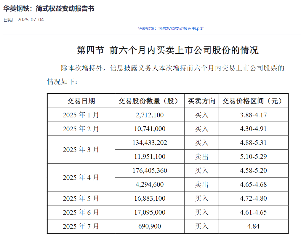 7月3日晚间,华菱钢铁(000932.SZ)发布公告称,股东信泰人寿自2025年1月至今,通过二级市场集中竞价方式累计增持3.427亿股,现已合计持有3.454亿股,占总股本的比例已达到5.00%。