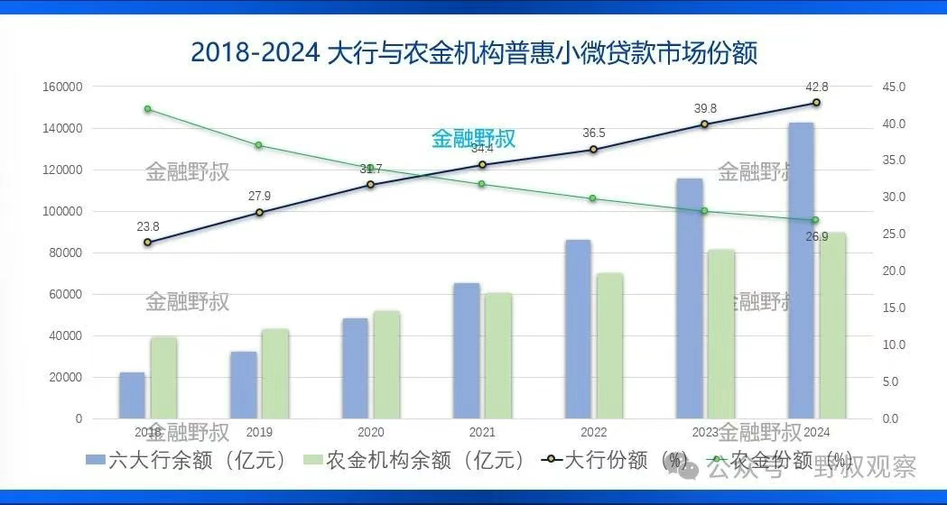 2、据监管统计数据,国有大行普惠小微贷款市场份额从2018年的24%飙升至2024年的43%,而农村中小银行份额则从42%缩水至27%。